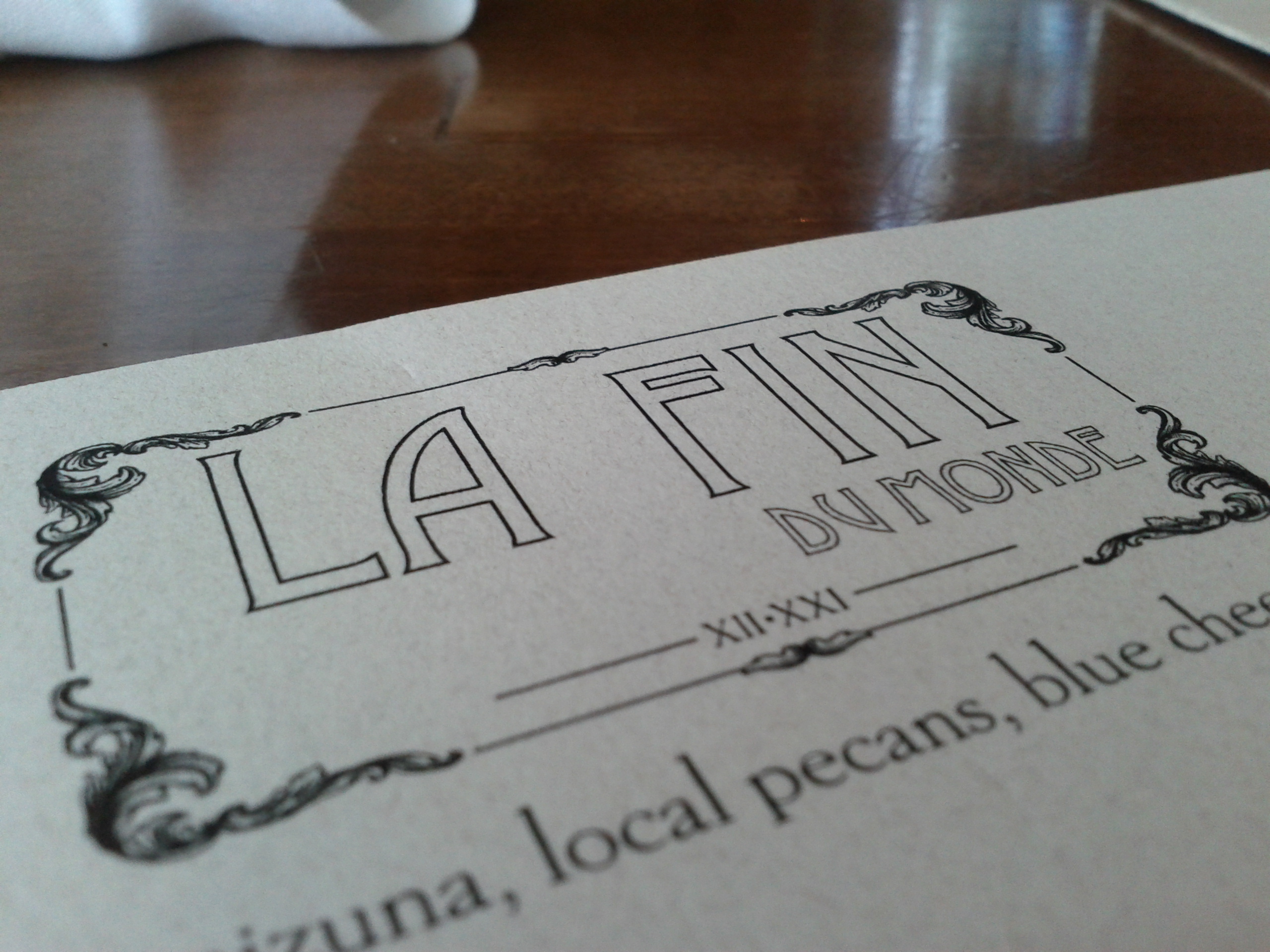 At first, I didn’t notice. I went to the hostess stand, looked around and thought, well, it is a little early for it to be busy. But then it occurred to me: it was already almost 1 pm. Why didn’t I have to wait an hour? And then it hit me — a new name … La Fin du Monde. What? The end of the world?! What happened?