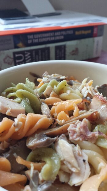 I figured that for now, I should stick with my go-to favorite: tri-colored spiral pasta with chicken and mushrooms. It took me a half hour in the grocery to realize that “ail” is garlic, and that “ail en poudre” is garlic powder. Add sea salt, onion powder, black pepper, and olive oil, and you’ve got a quick yet tasty ten minute meal. A little Tony’s would have been nice, but I’ll take what I can get. (Hint hint care packages) Makin’ groceries only goes so far here. ๐