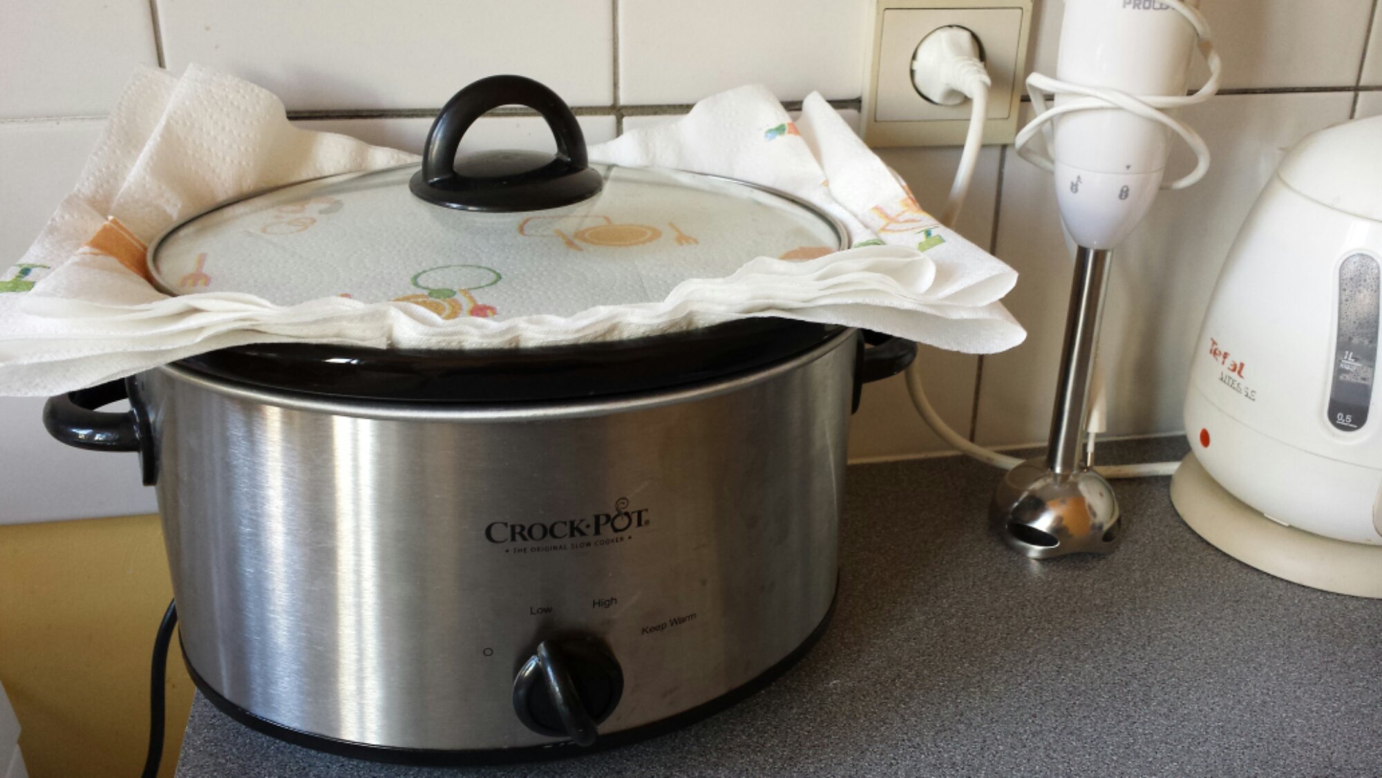 Then, cover and set to low. Yes, those are paper towels. In a traditional oven, it stays humid. In a Crock, not so much. The humidity in the Crock relies on the meats or sauces that you’ve added to the mix. Since we are baking UP and not cooking DOWN, we need an extra layer to keep all that good moisture inside!