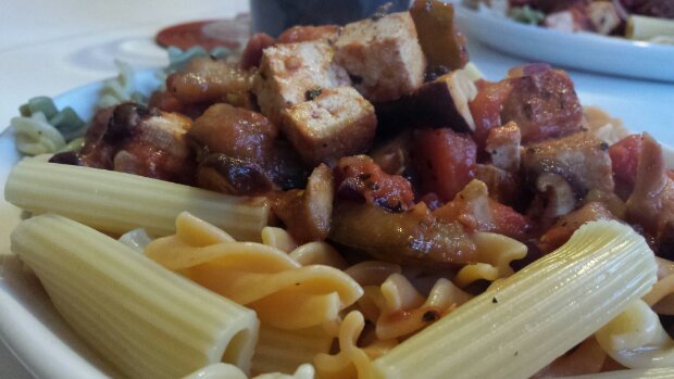 Today, however, courtesy of my flatmate, is the above goodness. Hearty, saucy, slightly spicy wok sauteed tofu, sundried tomatoes, shiitake mushrooms with spiral pasta and a few rigatoni thrown in for good measure. Top that off with a glass of Côtes de Bordeaux, and we’ve got a winner!